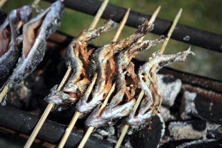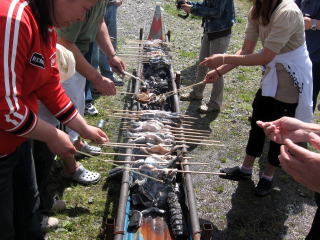 ニジマスのウロコ胃袋を取りニジマスに串を挿す 皆さん初めての方もいたので苦戦しておりました |
